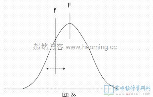 图中 小f所示是L和C842组成的谐振电路的谐振点。大F是振荡频率。可以看出谐振电路的谐振点和振荡器的频率不在一个频率点上。存在一个頻偏,并且谐振电路 的谐振频率低于振荡频率。从图2.28的曲线可以看出。谐振电路的频率要是增高,小f就靠近大F输出的功率就增加(输出的电压就提高),反之输出功率就下 降(输出电压就降低)。