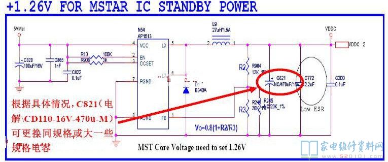 将位号C821电解(CD110-16V-470U-MM\C3F5\ROH,SAP编码:102032)进行更换,或根据实际情况适当加大C821的容量至1000UF/25V,下图是TLM40V68PK(RSAG7.820.1859)主板+1.26V MSTAR 芯片待机供电部分截图:
