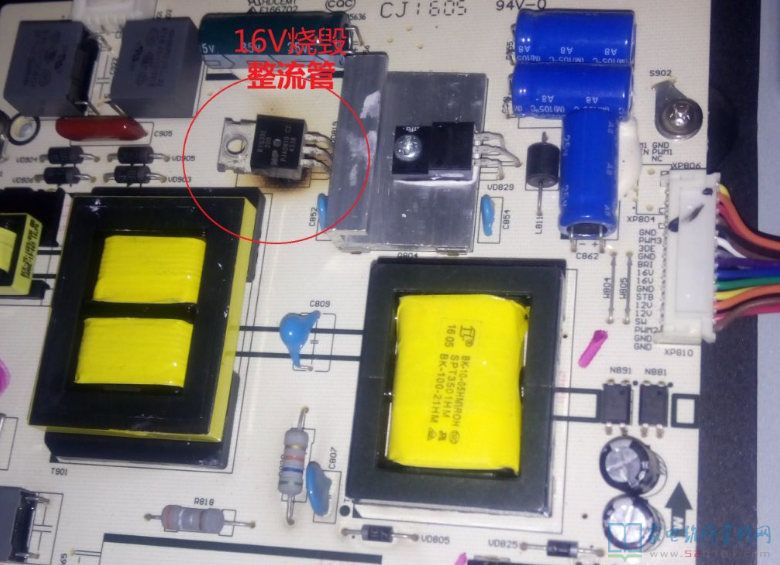 然后测量主板的12V对地没有短路,16V对地短路了,往前查,发现电源板上的16V整流管烧黑短路了,拆下来换之。16V,12V,都恢复正常了,机器能开机,屏也亮了起来。