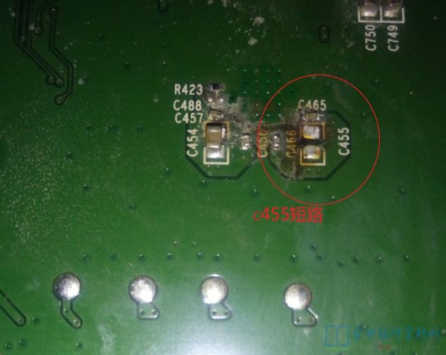 测量伴音集成TAS5711的供电脚2,3脚,对地短路,以为5711坏了,拆了下来,再测电路板仍然对地短路,仔细查看电路板,发现供电脚并有几个贴片电容,一一拆下来测量,果然电路板在背面其中一个贴片电容编号C455短路了,拆除不用。