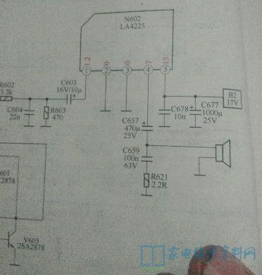 本人接到一台海信LED42K360J液晶电视,用户声称机内冒烟,拆机看伴音功放块NTP8212一角处烧穿,主板号是RSAG7.820.5277板,清理拆除烧坏元件,板不再冒烟,图像正常,分析这是海信通病,贴片电容引起,测功放供电空载19V电源板标16V电压,因主板烧穿无法买件维修,只有外加功放,想到了海信CRT电视应用最简单的功放LA4225集成块,用万能板搭接,电路简单,采用两块供电电容用两个470uF/25V分別接到4225的5脚,多用两个二极管隔离降压,输出电容用220uF/25v两个,输入信号来自耳机,图中R602试验后用1K电阻,和R603分压,C604末用,输入到1脚电容用的4.7uF加散热装好后声音正常。