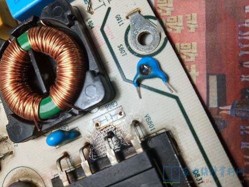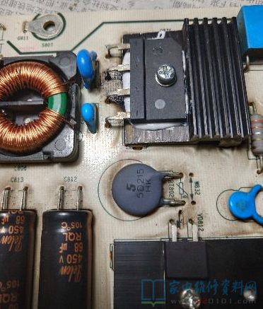 当天晚上打开机器后盖,测保险(4A/250v)已烧断,继续往后查,整流桥旁边的C606烧一黑洞,测桥正常,后级没发现有损坏零件,桥输出端无短路,换保险和471K/1Kv电容,插好各插头开机蓝灯闪,背光亮,开机音乐响起,接入信号源图声正常,机器修复。