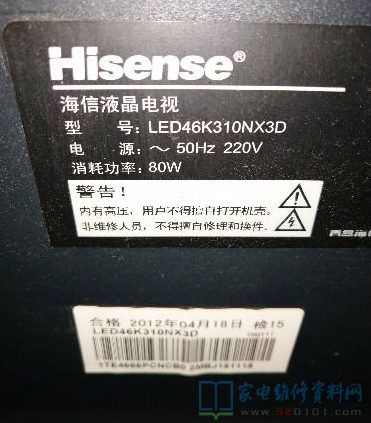 本人的一个顾客送来海信液晶电视LED46K310NX3D液晶电视,说他昨天晚上关机后,今天早上开不了机。后来在我的店里插电试机,电源灯不亮,整机无反应。跟客户谈好维修价格后,让他等待维修通知。