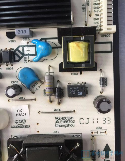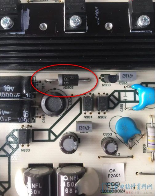 接下来常规检测保险丝正常,待机5V没有!300V正常!到此我心里就有数了,然后再测待机5V对地电阻为短路。马上直奔VD905的5V整流二极管SR560,拆下测量确实已经短路了,刚好手头上有SR5100,直接换上去,开机电视正常了,然后连续开机5小时监测老化,一切正常。