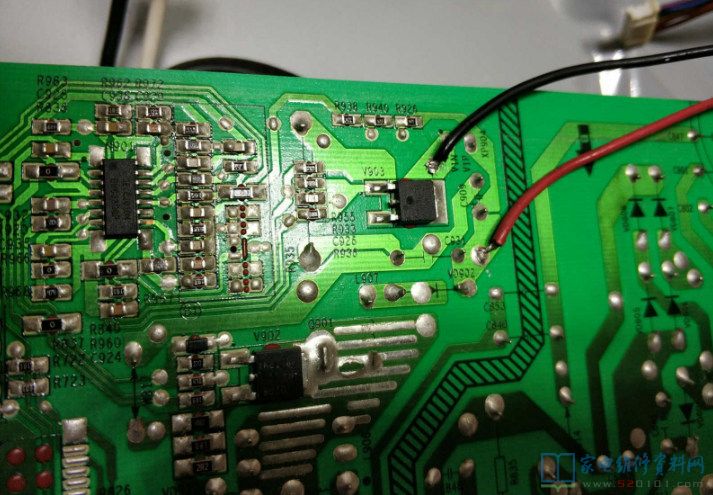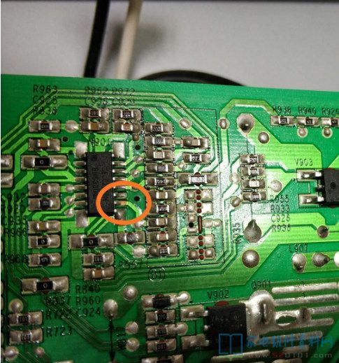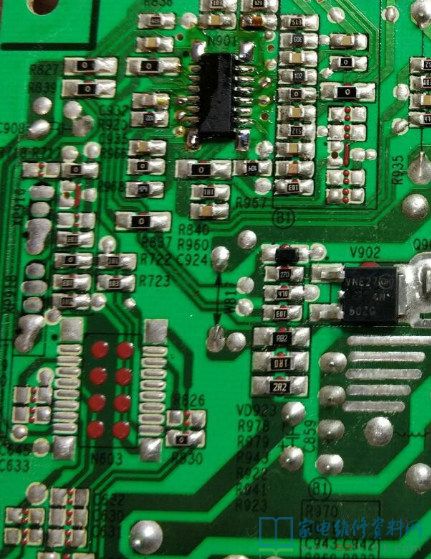 近日接修一台海信LED32L288液晶电视,客户说观看途中屏幕黑掉了,声音正常,有声音没有背光;当时给我我的第一感觉就是应该是背光LED灯条的故障,于是只带了一只手电筒和一把螺丝刀上门维修。首先到客户家打开电视,用手电筒一照,果然就是屏幕背光不亮而已,于是跟顾客谈好换背光的价格,把电视带回检修。拆开一测量,发现灯条插座没有供电电压,拔掉原机背光插头,用一旧的背光灯条组代换还是一样,电源和恒流是一体板,板号为RSAG7.820.5427 ,测量电源输出C859两端有100多伏,用二极管档测V903、V902好的,N901也有工作电压,因为没有图纸,正准备看芯片型号查图纸时,发现N901第10脚竟然没有上锡!而该脚外围有零件!证明该引脚应该是启用的,测量确实该脚与线路板不通。于是给该集成块(N901)所有引脚加焊一遍,电视背光亮了,故障排除。