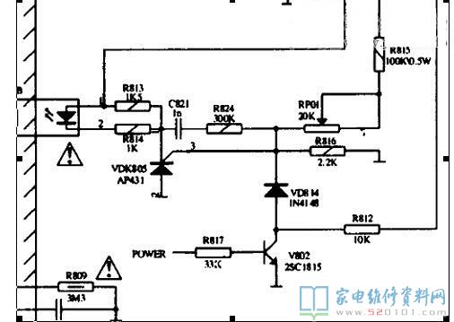 当按要求再把模块的灰色线接入电路做待机用时,又出现了上面故障时一样的情况,这时我才意识到本机真正故障可能还是在电源次级部分,将待机控制的极管VD814断开,故障现像马上消失。测待机控制管V802 C极二次开机状态仍有十几伏的高电压(正常为低电平)而B极尽然像是负压,用示波器测C极不是纯直流电平而是像是串入了行的波形信号,B极也是,而R817的输入却纯直流高电平正常,查R817已经锈掉开路了。换掉是R817装回5Q1265,再把R815也换回100K.调整+B 135V,终于完全排除了故障。该故障起先让人疑惑了的是此前一直还能执行遥控开关机,所以就没去考虑是待机电路的问题走了不小的弯路。