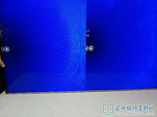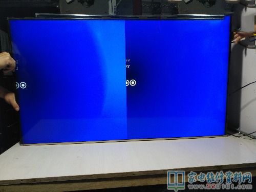 一用户拿来一台海信LED50k370液晶电视,故障表现为灰屏,有伴音,测得逻辑板VGL:-3.8V VGH:11.49V,判断为逻辑板坏,代换后故障依旧,但VGL为-9.78V,VGH为12.46V,去掉上屏的两组排线,VGH为29.40V,逐一分别断开左右两屏边板排线,发现当断开左屏边板排线时,VGH电压正常29.40V,仔细检查发现,左屏边板上屏薄膜有烧焦痕迹,果断切断后开机,久违的蓝屏出现了,但一幅图像却分成两半了如下图,怀疑逻辑板存储器程序异常,换上原机坏逻辑板存储器24芯片后,图像正常。