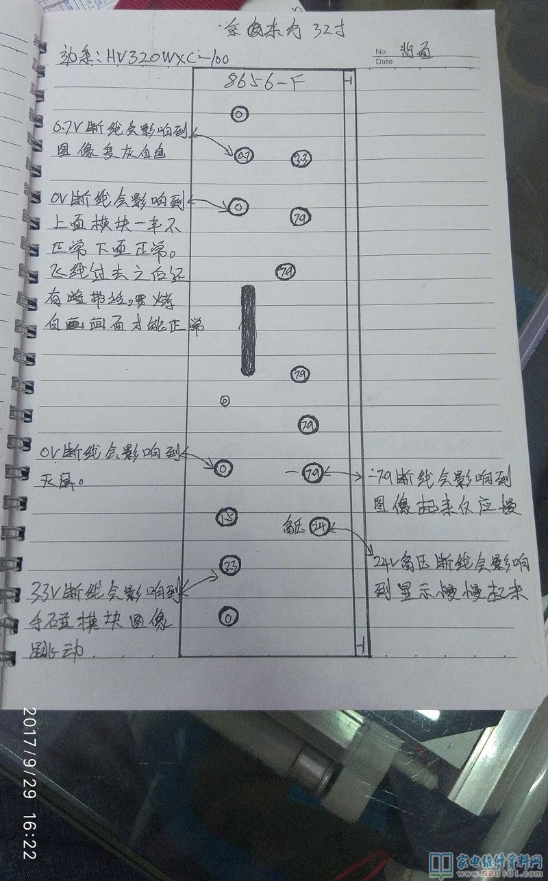 海信LED32K300液晶电视开机图像拉丝故障维修 2020-01-29 01:06:47 阅读 444 次 评论 0 条 摘要: 维修一台海信LED32K300液晶电视,故障表现是开机图像拉丝状,四角收缩,字符反应慢(不是立即显示)。拆开机器,发现这个机器配屏是京东方320WXC-200,编号47-600385,测量边板高低压均正常 维修一台海信LED32K300液晶电视,故障表现是开机图像拉丝状,四角收缩,字符反应慢(不是立即显示)。拆开机器,发现这个机器配屏是京东方320WXC-200,编号47-600385,测量边板高低压均正常,拆屏,测量Y-COF,VGL-7.5正常,VGH只有3.62显然不对,对照测试图,飞线VGH恢复正常,Y-COF:8656-F。机器修复。 版权声明:本文为转载文章,版权归原作者所有,欢迎分享本文,转载请保留出处! 点赞 分享: PREVIOUS:海尔32寸液晶电视灰屏故障的维修过程 NEXT:TCL L42F1590B液晶电视灰屏故障维修 文章导航