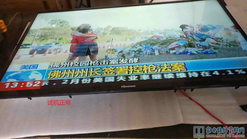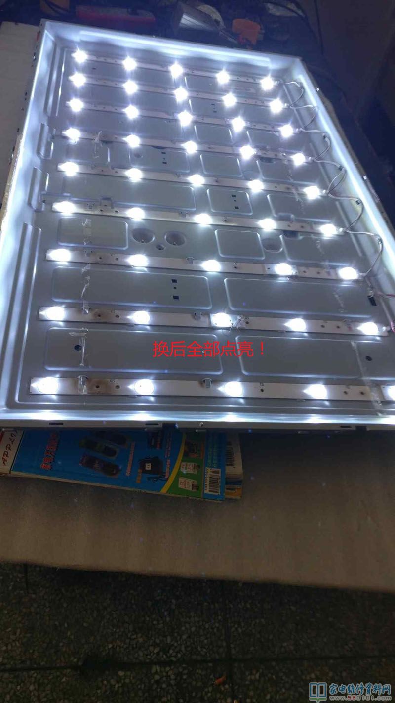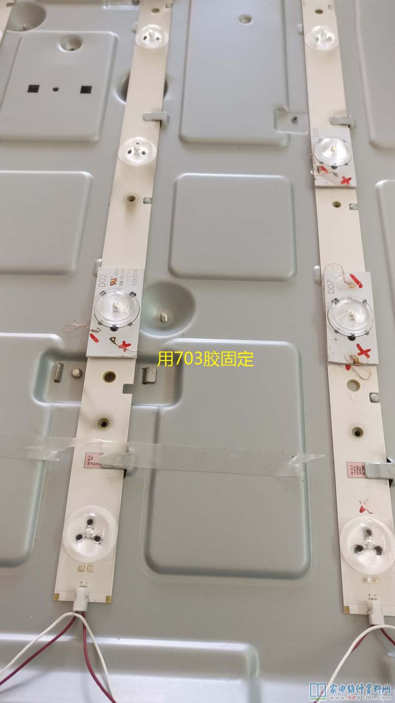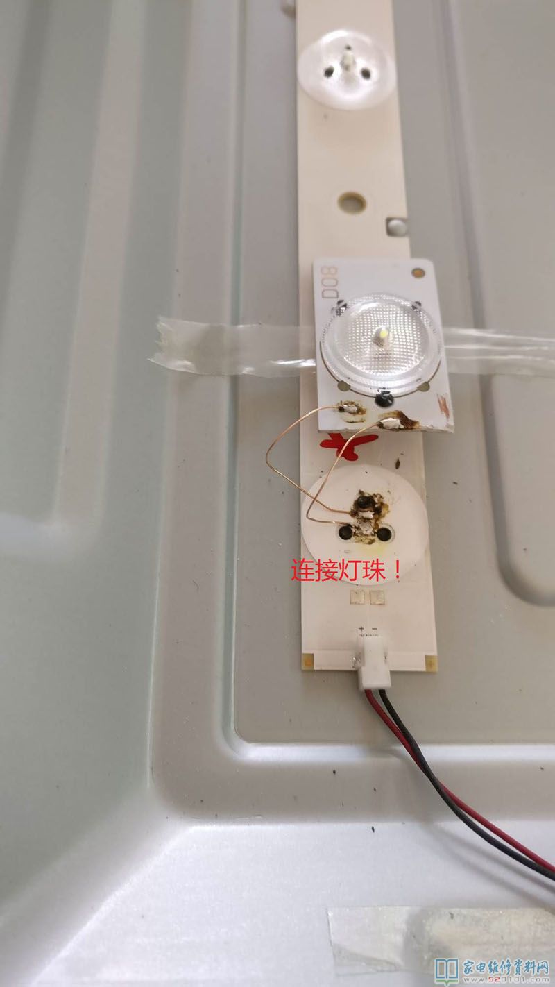 刚好手边有一台创维32寸的坏屏的就机器,用测灯仪测量单颗灯珠电压,里面的灯珠电压与这台海信的一样,就拆下灯条来,用剪刀一个个剪下八颗,用线按正负极接在烧坏的灯珠位置,并用703胶固定好。把那些坏的灯珠更换后,一组组测试了电压,每组都是12.6V左右,(12.6/5=2.52V),单个灯珠2.6V左右,都在正常范围内。