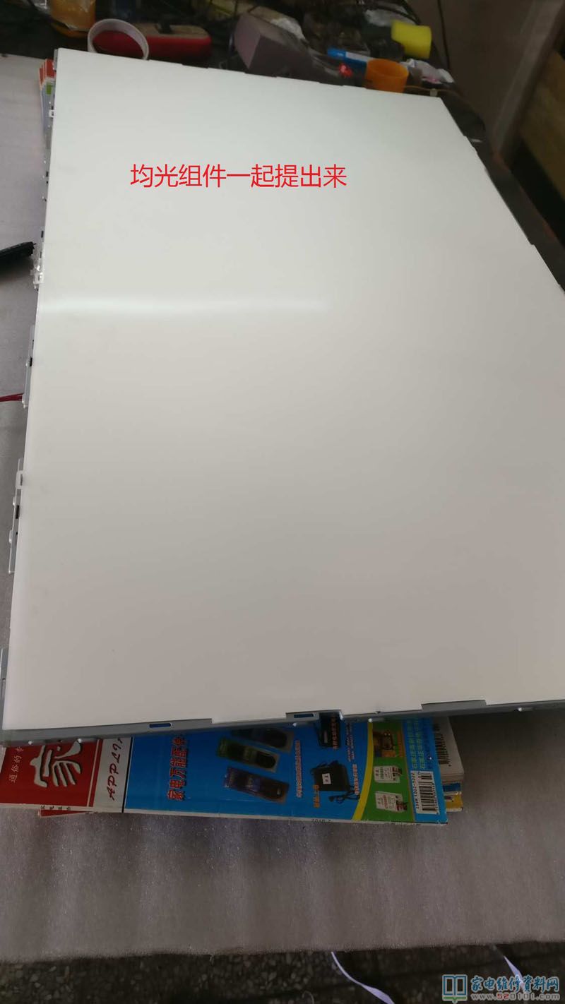 LED42EC260JD海信电视,故障现象为上电开机有声无光(黑屏),拆机测量背光电压近210多伏,用点灯仪测量也不亮,说明灯珠开路了。准备开屏修理,在拆屏框架的时候,发现有几个螺丝少了没装,说明这个屏以前就有人拆过,用吸屏器及屏,轻松移开;均光组件一同托下,见里面圆帽盖灯珠,共有45颗。用测试仪一组组测量,发现总共有八颗灯珠烧坏。