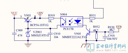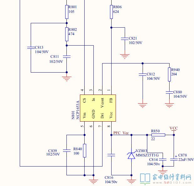 于是测量负电源供电280V应该是待机状态,开机后应该是380V左右。测量V903基极有波动的电压,发射极没有电压,估计是没有给PFC芯片供电造成没有380V拆了V903测量正常,发现发射极对地短路。拆了C878发现电解电容短路,导致更换C878后一切正常,机器修复,这50V/22UF的小电容短路在我日常维修中很少遇到,提醒同行借鉴。