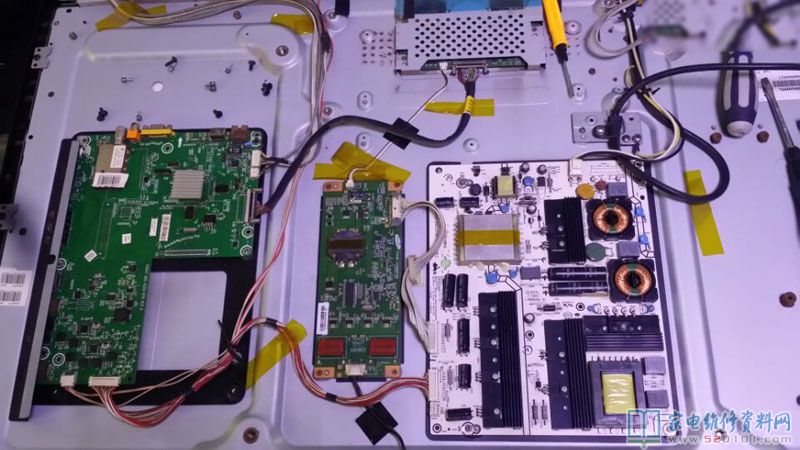 根据以往经验,先到网上去搜了一下该机的资料数据,搞了半天没找到该机的程序,还说准备用r809F给他写一下程序的,这下不能写了,要是给客户换板,费用高了怕他不能接受,试试看能不能修复吧,到网上看了很多同行关于该机的维修资料,有的说是主板上外接的一些地方漏电,比如触摸板,拔掉后就可以开机了,我正准备去拔掉主板到触摸板的排线,发现排线早被人拔掉过了,回想客户说的他这台电视厂家售后的来修过,然后触摸时间久了用不起了,原来是这样,可能前面修的人不知道是忘记插这个线还是当时修的时候故意拔掉的,因为之前这台电视也是出的和现在一样的故障。