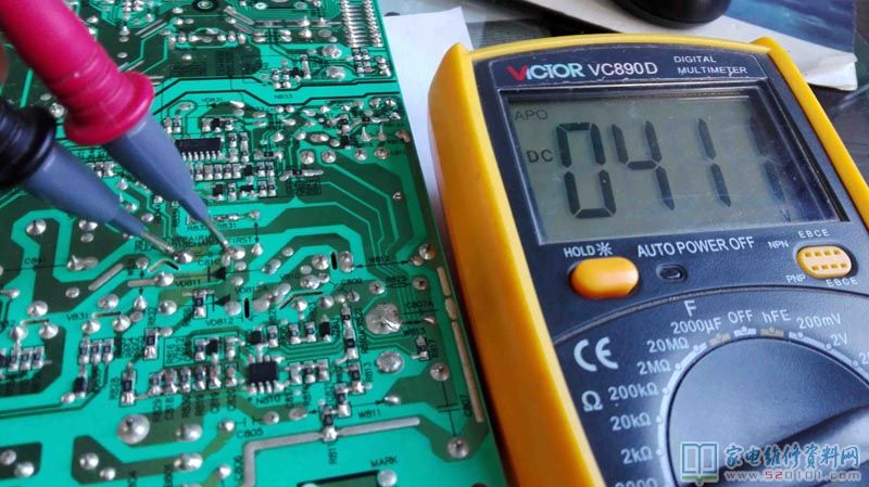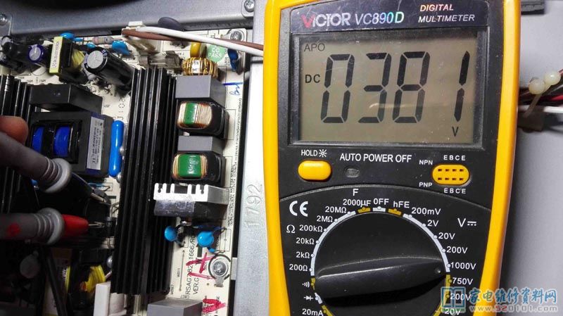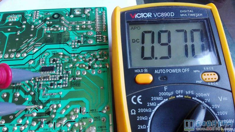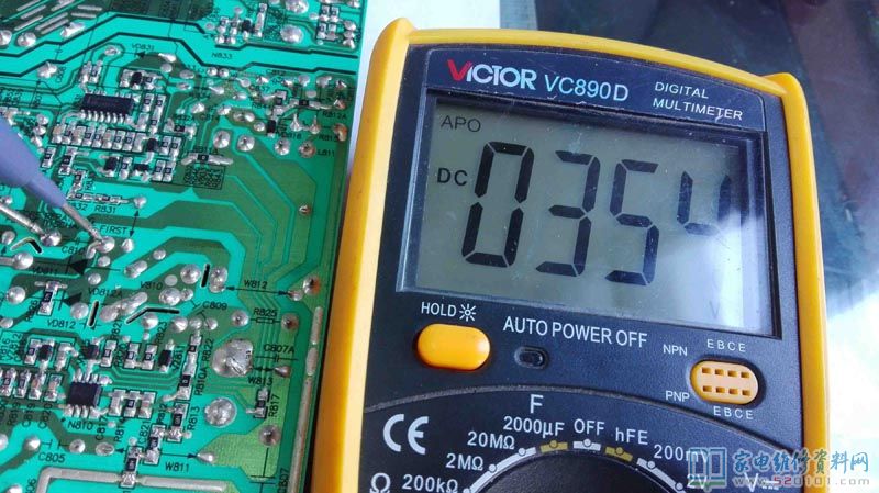 为了验证判断的准确性,我把PFC取样电阻的一个510K的“容祖儿”换成420K的电阻,PFC电压降低为350V,测主电源芯片第5脚的电压也降低到0.97V,此时电源芯片停止工作,主电源停止输出。