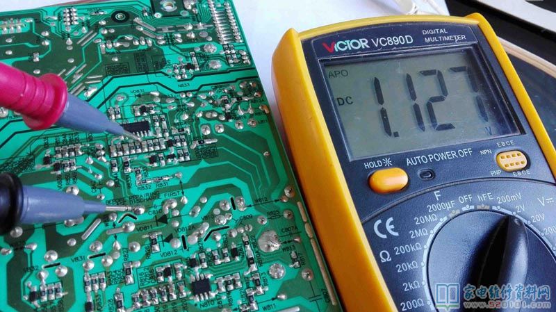 在电视正常开机的情况下,测得电源芯片第5脚的电压是1.127V。