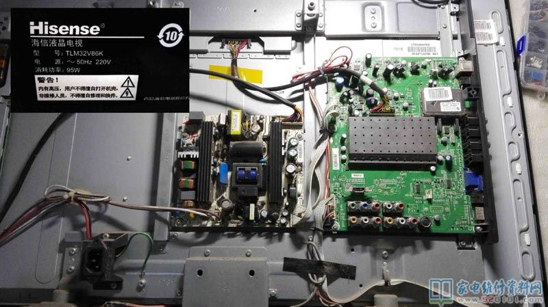 本人正在自学液晶电视维修,一个朋友便把家里弃修的海信液晶电视送给我练练手。他说这个电视以前就出现不能开机的故障,后来不能开机的次数越来越多,最后彻底不能开机了。他给售后打电话,售后说修好要400多块,嫌维修费太贵,所以就不修了。这台送来的液晶电视背面铭牌如下图所示。