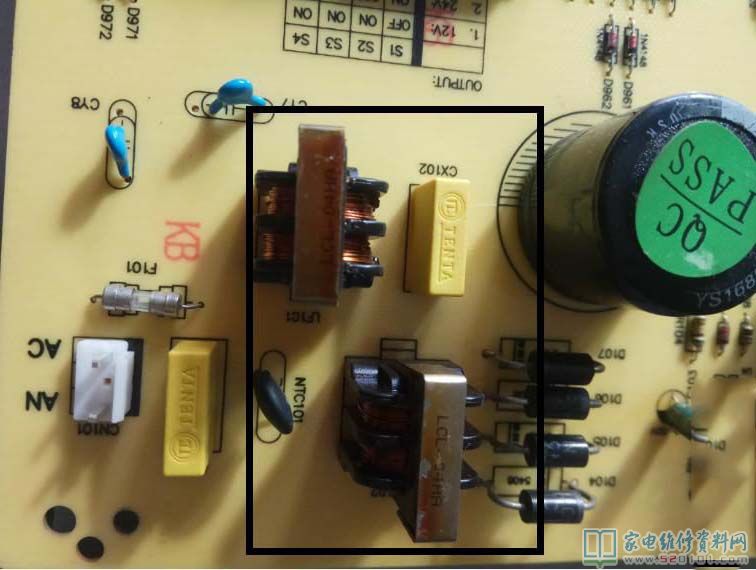 一用户送来一台海信TLM4236P液晶电视,说图像声音都有,就是不敢看,电视里面有“发电机”一样的声音,屏幕中间有点波浪,通电试机果然传来像老式日光灯镇流器松动的声音,拆开发现电源高压一体板已经被换成代用板,通电试机声音是从EMI滤波电路的电感发出,用手摇一下磁芯明显松动了,从废液晶电源板上拆两个原装电感,装上去试机“发电机”声音消失,屏幕中间干扰条也不见了,成功修复用户很满意。