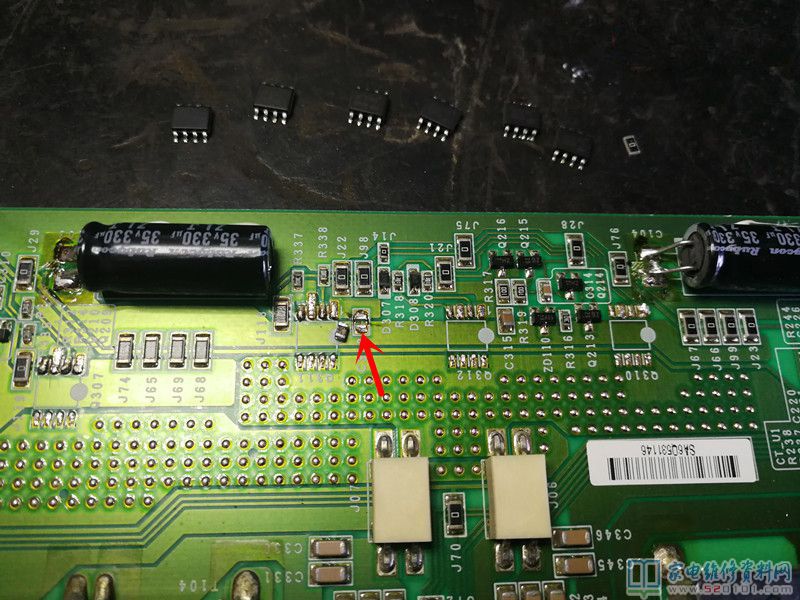 找来以前用电源板改的维修电源接入24V电路,电压调整到3V 0.5A时C313贴片电容已经冒烟!取下此电容24V已不再短路,找个同等电路上的贴片电容拆下测量为1.18UF,找了只贴片电容和保险装上装上,恢复以前拆下的其它原件装机修复。