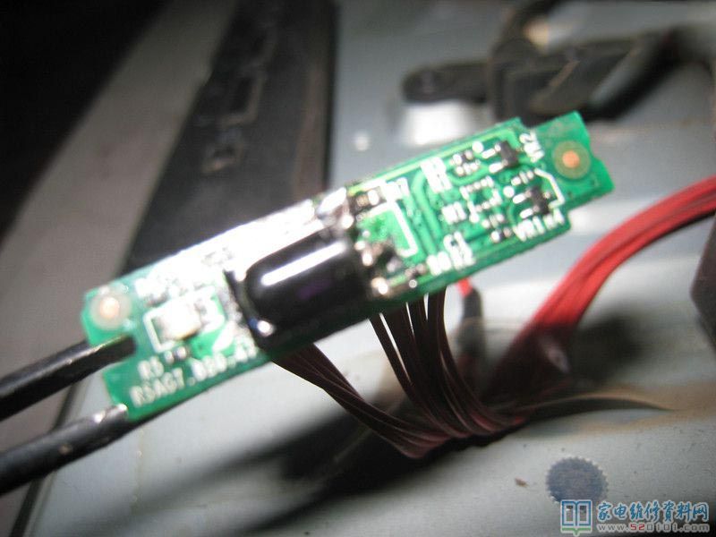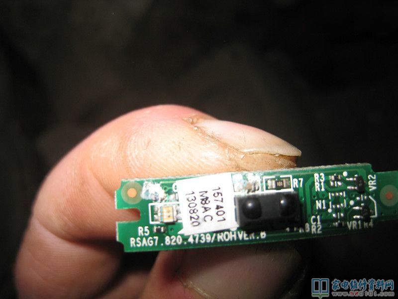 一客户拿来海信CN-22601遥控不起作用要求换新的,习惯用遥控接收测试器试一下,结果是好的。就告诉他遥控可能没坏,换电池再试一下,如果还不起作用电视损坏的可能性要大些。这一大早客户将电视遥控全拿来。通电试机,本机按键没问题,正好有一海信TLM24V86P电视,试一下遥控所有功能居然都能用,电视确定损坏无疑,拆机卸下遥控接收头转换板,目测发霉,用放大镜一看线路腐蚀断了,用洗板水刷了一下焊接C2与R7,C2为5UF贴片 R7为100欧。费劲巴力的鼓捣半天上机一试无果,这接收头个太小,只比大米粒大一点单排四脚。找一影碟机接收头去掉屏蔽剪去过长一脚焊接好试机正常,比原来大就用热熔胶固定即可。