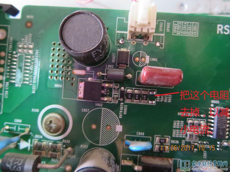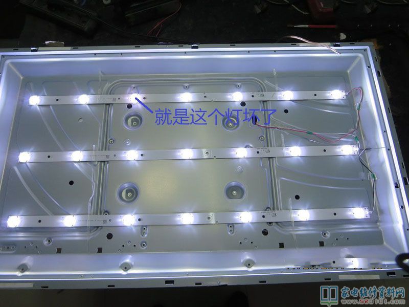 静下心来想我何不把背光点亮看看屏是什么情况,于是用自己制的检灯仪来点,先用100v档不亮,后用250档还是不亮。但板子上测的电压也只有110v左右,心想可能是灯条出问题。难道这死机与这灯条坏了有联系?不管怎样用假负载来试一下背光电路。假负载接上,插上电有开机声,这时用遥控器和机子上按键都能开关机。哦原来灯条坏了还能出现死机,真是头一次遇到(主要是知识不足)。拆开屏发现有一只灯珠坏了更换后机子正常。