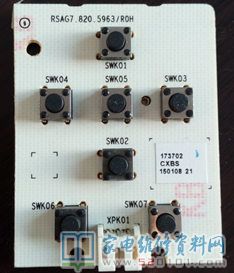 经过拆机检测,各组工作电压基本都正常,在把各个关键点和电源部分主要部件,变压器引脚,电源IC,整流桥进行补焊加强后,直接检测按键板的电阻值和按键闭合时的电阻,经过检查电阻值基本正常,按键的闭合电阻,有点不正常。。。 正常轻触按键闭合时候,电阻应为0欧。超过一定数值,即为损坏或不良,于是将所有按键全部拆下检查,发现有部分按键的引脚发黑,引脚边的绝缘塑料,已经有击穿和碳化现象,于是将所有的按键全部用新件代换后,经过30分钟的试机,故障不再出现,装机后,机器修复。
