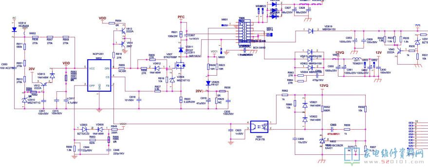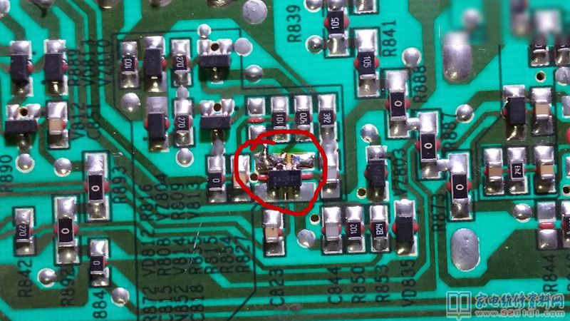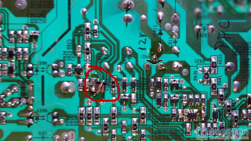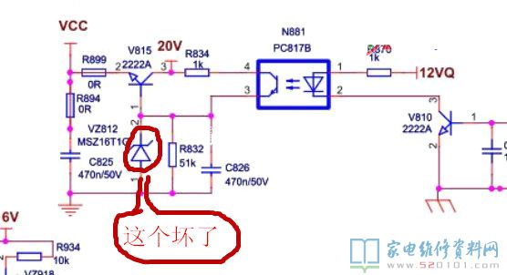 接修一台海信液晶电视,故障表现是通电指示灯蓝色灯闪烁,但是不开机,拆开机器,给主板供电插座测12v只有3一8v变化.而板子上写的16v一组测得20v很稳定,变压器初级18v只有1一3v变化,后换ncp1251块无效。断电后测18v正、反向电阻,正向100欧,反向200欧,说明那里短路漏电了,后测得帖片稳压管vz812,msz16t1g漏电了,要从板子上取下测的。用两只8.5v稳压管串联接入电路后开机正常工作。