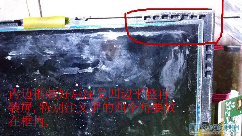 9、内边框装好后注意四边平整再装屏,特别注意屏的四个角要放在框内。