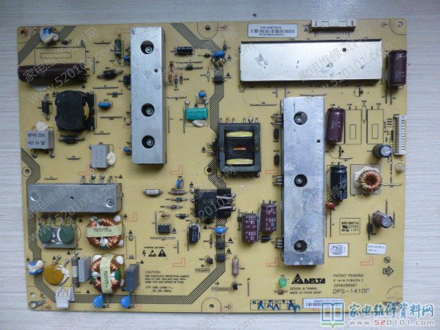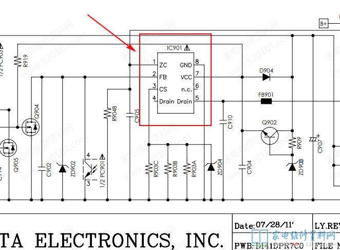 接修一台海尔LE42Z300R3D液晶电视,故障表现为三无,拆开机器,其电源板型号是DPS-141DP,目测IC901炸裂,网上下载该机型的电源板图纸,但是没有标注没有元器件型号,最后查到型号是ICE2QR4765,更换后故障修复。