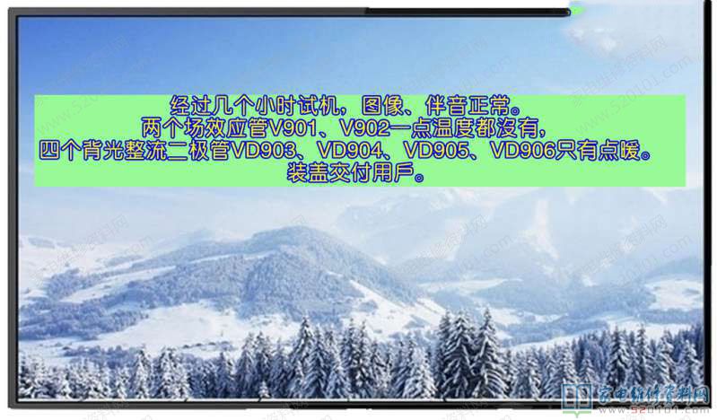 经过几个小时试机,图像、伴音正常。两个场效应管V901、V902一点温度都没有,四个背光整流二极管VD903、VD904、VD905、VD906只有点暖。装盖交付用户。