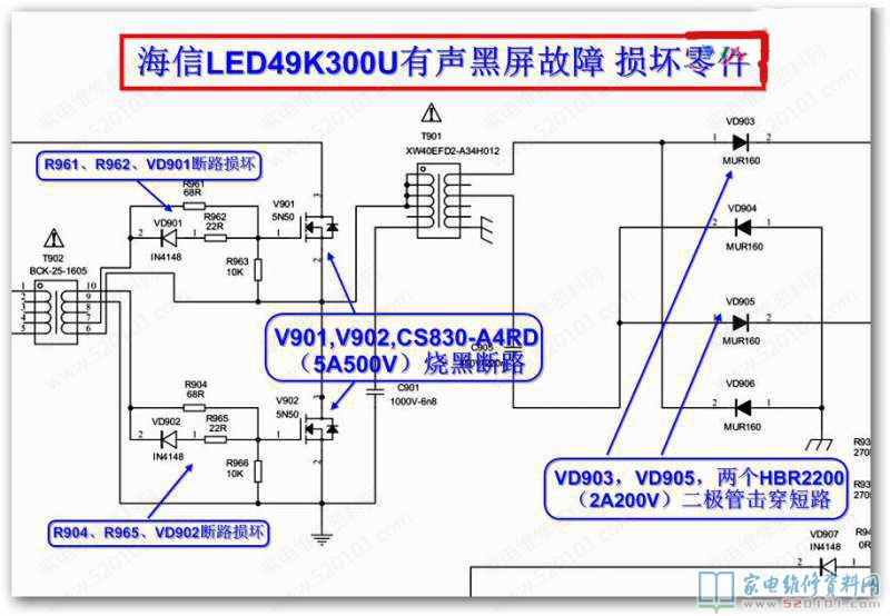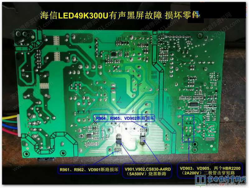 最后分析一下此故障原因:海信LED49K300U电源板RSAG7.820.6389/ROH四个背光整流二极管图纸上标的是MUR160(1A,600V)快速恢复二极管,而实际用的是HBR2200(2A200V)肖特基二极管,板标额定输出200V/400mA。新电视机还可以,电视使用了几年灯条老化、打火、电压大幅度波动等等以致HBR2200(2A200V)肖特基二极管承受不了击穿,连带相关零件也跟着损坏。海信LED49K300U有声黑屏故障有的只损坏VD903、VD905;有的损坏VD903、VD905、V901、V902;这台最严重,连两个场效应管的相关零件R961、R962、VD901,R904、R965、VD902也断路损坏了。这故障应该是这款机型的通病。