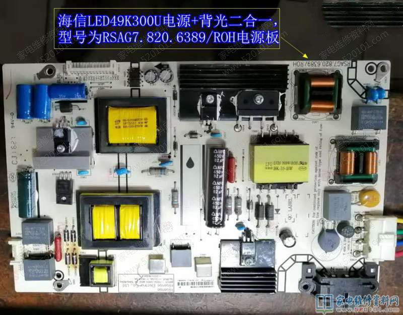 查看海信LED49K300U电源板是采用电源+背光二合一,型号为RSAG7.820.6389/ROH电源板(原理图)。