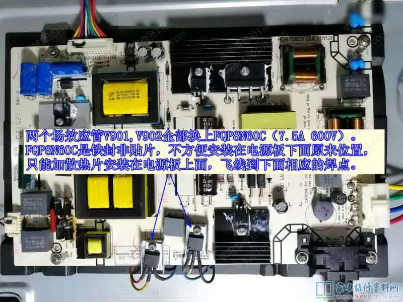 综所上述,更换的零件要比原件耐用才行。我的方案:VD903、VD904、VD905、VD906四个背光整流二极管全部换上肖特基二极管 SB5250(5A 250V);两个场效应管V901,V902全部换上FQP8N60C(7.5A 600V)。FQP8N60C是铁封非贴片,不方便安装在电源板下面原来位置,只能加散热片安装在电源板上面,飞线到下面相应的焊点。