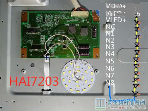 测一下背光此时电压为42V,决定就在电视机背面接一个LED灯珠串。于是就拆了一个家用的LED灯改装,用了是12只灯珠串联点,对应接在VLED+和N8。再次开机背光长亮,故障现象基本解决。
