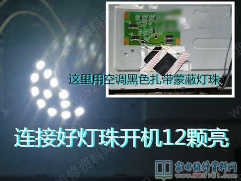 然后在加的灯板抹上导热胶,粘在铁壳上。亮点用黑色空调扎带盖住,开机背后看不到亮光,这电视就算是修好了。
