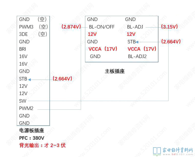 接修一台海信LED49EC270W液晶电视,故障表现为开机蓝灯亮,但是无任何显示,指示灯能遥控开/关。拆机,其电源板型号是RSAG7.820.6389,测量PFC 380V电压有,背光输出只有几伏,液晶用强光手电射,能看到字显示。此故障判断应该是LED灯板损坏,每条灯板(共4条,每条9个灯珠)都有几个灯珠不亮了。