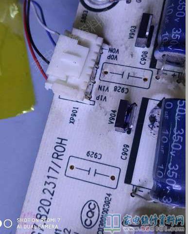 正常开机,但发现灯条半边不亮,结果查出电源板有一个场管不知啥原因劈开了,拆个旧件有些大,焊在反面试机,已恢复正常。此机芯片虚焊的也不少,待长时间测试后交付给客户。