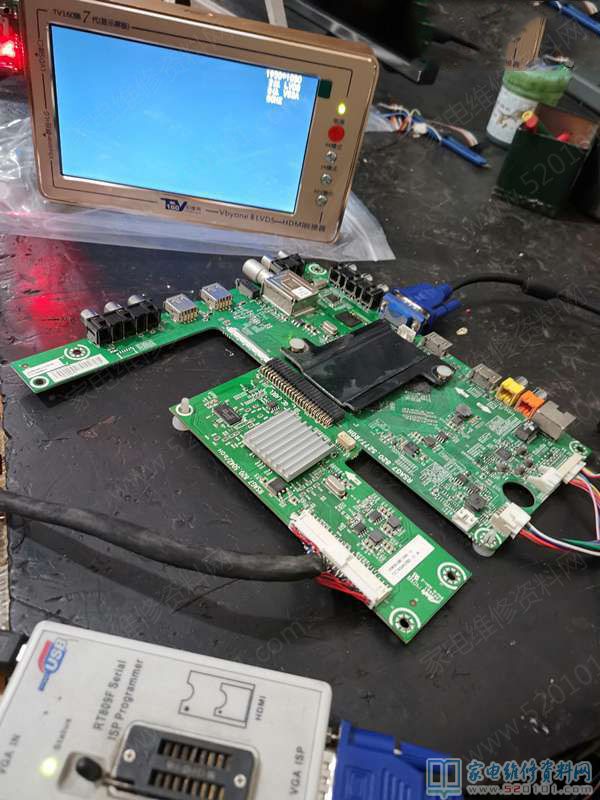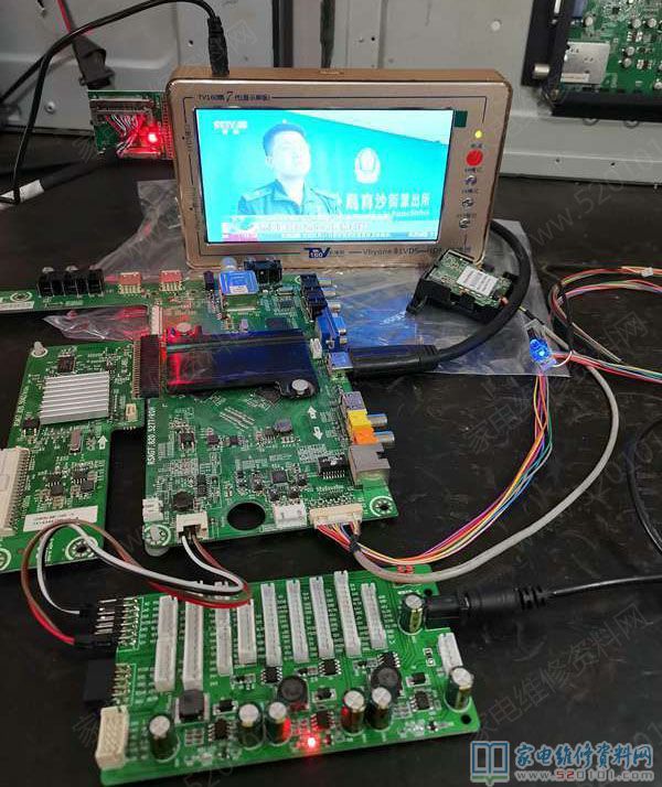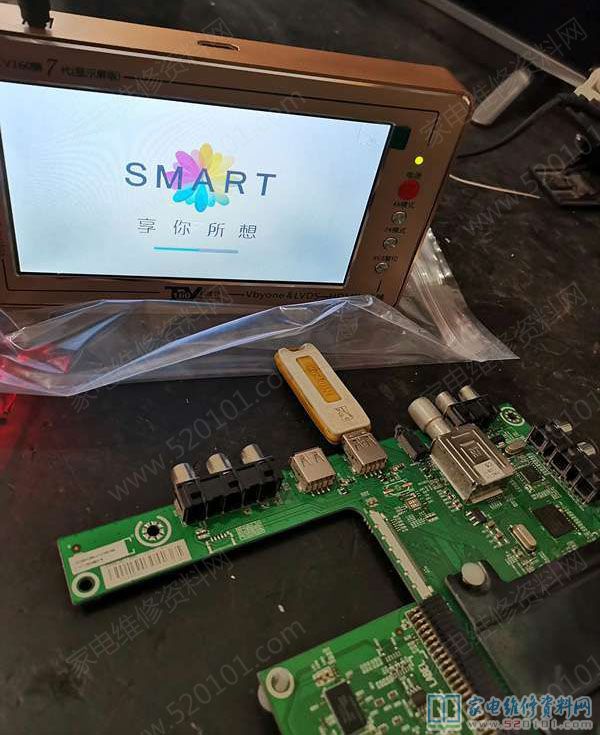 由于没有这台电视的EMMC备份数据就写了一台50寸电视同型号主板备份数据进去,装上EMMC主板通电开机TV160转接板指示灯亮屏无图像显示。