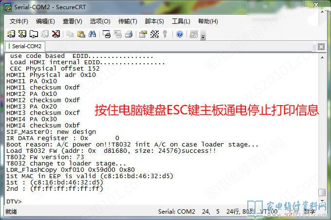 看打印信息显示正常,主板断电后按住电脑键盘ESC键主板通电打印信息显示DTV后放开。
