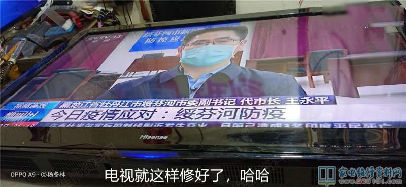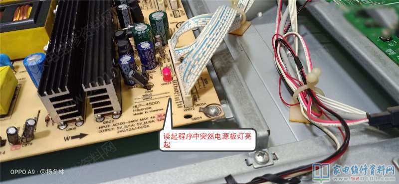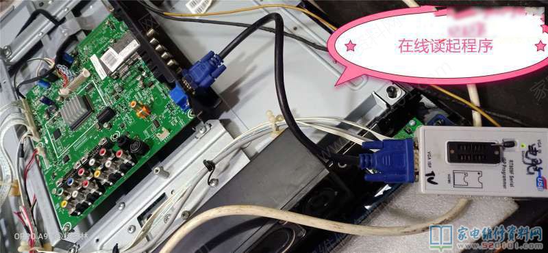 接着用手按面板上的待机键,见按键上的蓝灯指示亮起,虽然有反应,过一会儿又自动灭掉,但测ON/OFF电压始终不出现,感觉主板程序有问题。于是拿出RT809F,连接主板上的VGA接口,再接上电脑,在线读起主板上的程序,在编程器校验读起的程序时,突然见电源板上的工作指示灯亮起,接着就听到电视启动的声音“海信”后,只见电视背光亮了,这电视就这样修好了,应该是编程器校验修复了错误程序。
