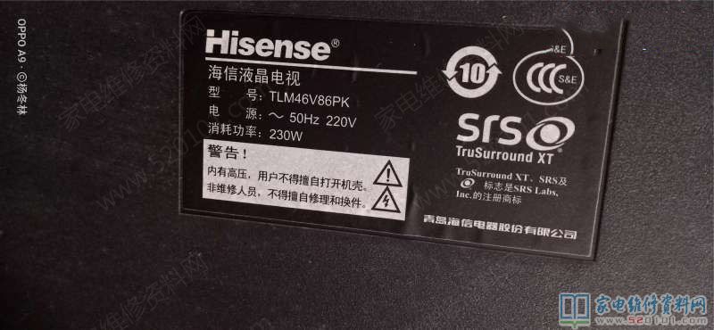 接修一台海信TLM46V86PK液晶电视,型号如下图,上电开机,指示蓝灯亮,不开机故障,首先拆后盖,测量ON/OFF开机电压,3V左右电压一出现立即降为0V,除了5V待机电压存在,其他的12V;24V等电压全无,用摄子短接ON/OFF端与5V之间,只见电源板工作指示灯亮起,测量12V、24V等电压都出现了,说明电源板正常,问题出在主板上。