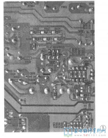将上述损坏的元件全部换新,单独给电源二合一板通电,测得主滤波电容C810(100uF/450V)两脚间电压为300V,次级整流滤波电路无12V电压输出。断电后先对CB1。放电,接着在路测量次级整流二极管VD812(HBR20150),其正反向电阻均正常,怀疑电源集成块N801(0132259AP)损坏。更换N801后试机,故障排除。