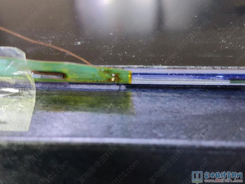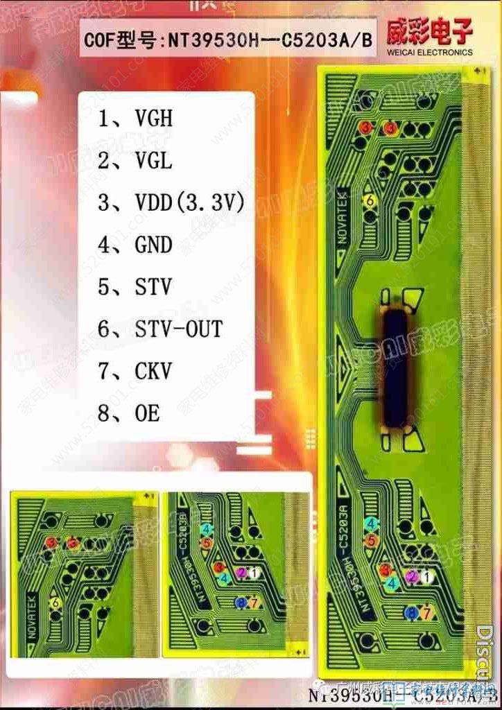 于是拆开屏幕,看见旁边用的COF是NT39530H-C5203A,于是找飞线图,结果测试发现NT39530H-C5203A其他点点呀正常,只有VDD3.3V右边上下两个点有一个点没有,于是飞线连接两个点,三个cof电压没有那个点都有了,现在试机电视机故障一直不出现了,还有没有连接那个点时候用手碰触任何一个COF图像都会消失或是闪动,现在就再也不出现了。