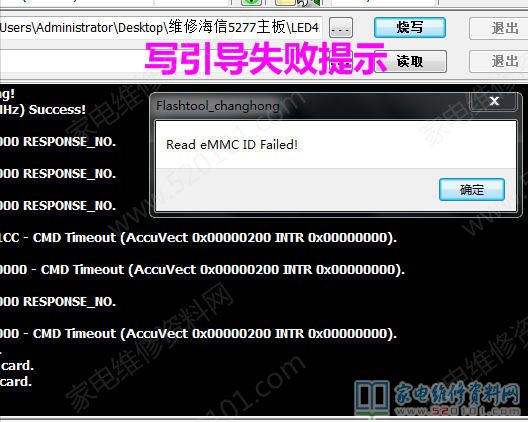 接修一台海信液晶电视机LED55EC280JD(BOM2),故障表现为不开机,只拿主板RSAG7.820.5277就转手到我这,放置好久了。接上主板12v供电, 测量5V、 3.3V、 1.5V 、 1.2V均正常,连上编程器无打印,试写引导mboot提示“read EMMC id failed!".意思是读EMMC失败! 试按"ESC"键开机,串口打印开机也不能进控制台,咨询同行师傅说可能是emmc坏。此机emmc是2G海力士2100。