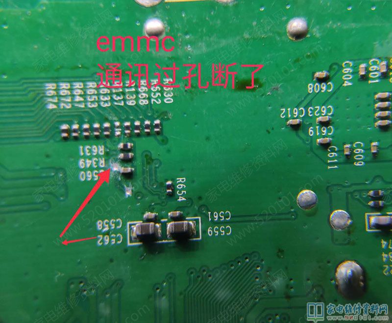 于是心静下来慢慢思索着。不识别emmc要么是主芯片坏了,要么是主芯片与emmc通讯不畅。主芯片拆装已好多遍了坏得可能性较大,但是手中也没有这mt5505akdi芯片,困难重重呀。既然我与这主板较上劲了就不服输,还是先查通讯吧,用放大镜仔细慢慢查过孔终于有了不通的孔,心里有点暗喜 连好过孔通电仍写不进引导,真是白高兴一场。心想,既然能发现过孔故障,还有多路的通讯何不测量它呢,之前光测量过孔时间就近一天时间。