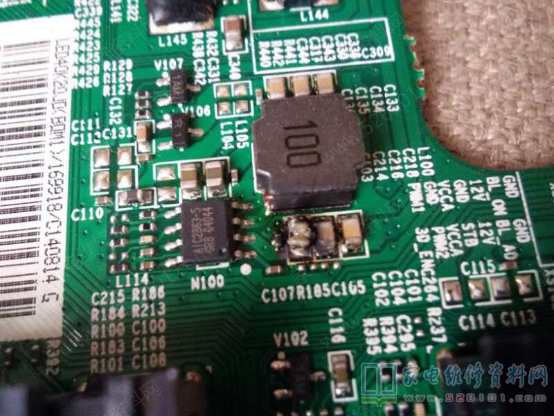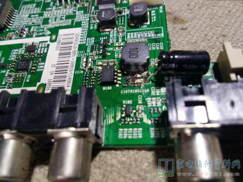 接修一台海信LED40K20JD液晶电视无红灯,无光无声,拆开目测未见异常,测电源电压12伏,检查时看见主板有冒烟出,赶紧拔电,发现c102、c104,c101处的c102明显烧坏,将c102、c104、c101全部热风枪拆除,更换一个100uF/35V电解电容,把烧坏的铜箔链接好,主板修复,故障排除。
