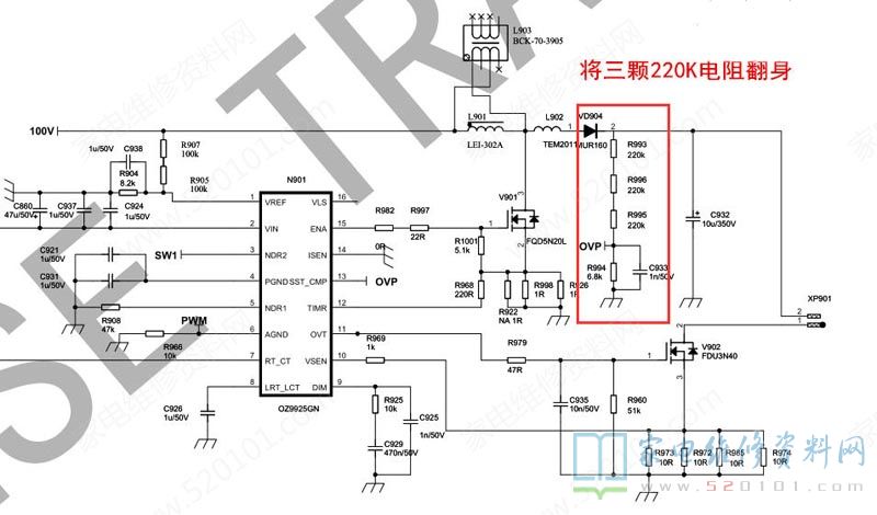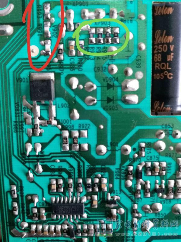 根据图纸分析和热心好友的帮助,重点检查了背光升压取样电阻R993,R995,R996三颗220K电阻,拆机测量阻值正常,清理好电路板,将此三颗电阻翻身反装,再次开机背光正常点亮,证明故障确实是这几颗电阻漏电所致。