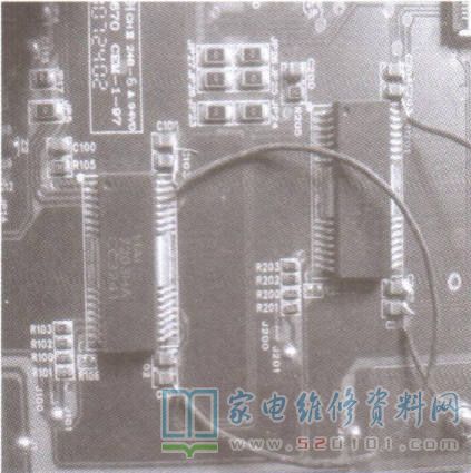 为保证维修质量,购回同型号灯条装上试机,灯条闪亮一下后熄灭,其原因应是背光驱动电路进入了保护状态。检查扁平软排线及其接口均正常;用灯条测试仪测量8组灯串,都能点亮,且亮度均匀,每个灯珠的电压均为6V。分析认为,导致背光驱动电路保护的原因可能是该电路的保护灵敏度过高,或者某组灯串电流过大。查看灯条电流检测线路,发现其检测电压来自芯片HA17203附近电容C101~C104、C201~C204的非地端。试用两段导线分别.将C101~C104、C201~C204的非地端连接在一起,如图1所示。