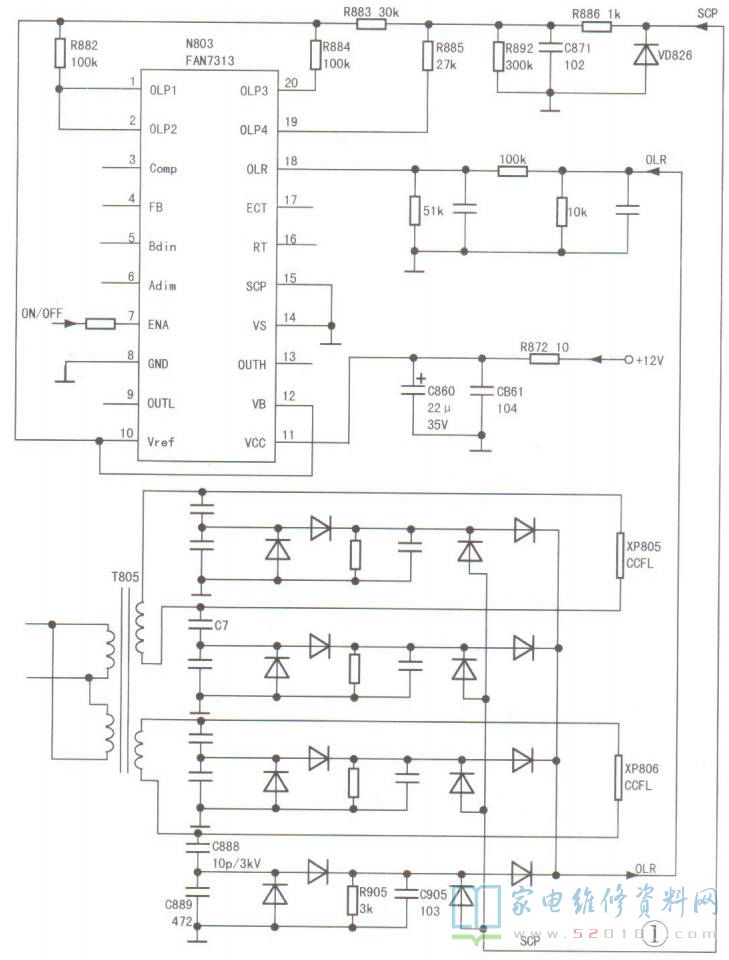 接修一台海信TLM32V86K型液晶彩电,开机后背光一亮即灭。上电,测量输出的各组电压均正常,怀疑故障系背光电路保护所致。该机背光驱动芯片采用FAN7313(N803),如图1所示。测N803 7脚(使能端)电压一直为高电平,说明主板已送出点灯信号。N803的1、2、19、20脚为灯管断路保护端,当某脚电压低于1V时,N803进入保护状态。N803的18脚为高压检测端,当该脚电压高于2V时,N803进入保护状态。实测上述引脚电压,发现19脚电压约为0V ,明显异常。检查19脚外围电路,发现贴片电容C871漏电,换新后试机,故障排除,此时测得N803 19脚电压约为4V。