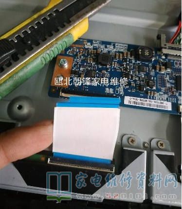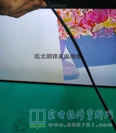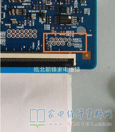 一台海信50寸液晶电视,故障现象是开机暗屏。检查发现是屏坏了,有一边屏短路,拉低电压导致黑屏。断开短路那边屏的排线,屏幕能亮了。这种情况有些人想到的就是撕耳朵来解决问题,但是要对屏进行破坏,另外拆屏有风险。于是先找到那些地方有短路,检查发现是图中红圈里的LC、HC、VSS总共10个点,还有一个脚未标注。是这些脚相连的电路短路引起的。这11个脚在排线上是连在一起的。我用美工刀直接把这11个脚对应的排线割掉。重新插回去试机,屏幕恢复正常,肉眼观看没有发觉出哪里有瑕疵。