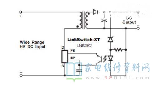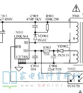 NK564第3脚外接供电,LNK364则不需要。初步判断应该可以直接代换,于是直接用LNK364代换LNK564,并将小桥堆去掉,用4只RL207桥接整流。上电副电源正常工作有5.4V输出,上机后通电故障排除。后试着将其第3脚外接供电断开后通电依然稳定输出5.4V。装机连续试机1小时左右手摸LNK364并没有温升。至此LNK364可以直接代换LNK564。