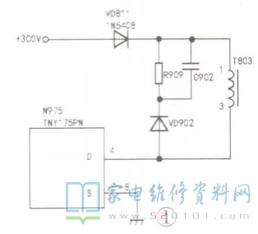 断电测量,T803的①、②脚通,但②、③脚不通。因T803的③脚与电源模块N975( TNY175PN)④脚连接,于是用M47万用表R x 1k挡测量N975的④脚对地电阻,均为300k,正常时应该为无穷大,估计N975击穿,大电流将T803的②-③绕组烧断。拆下T803检查,发现③脚连接焊接柱的漆包线已熔断。找来-段柔韧性好的金属丝,连接好T803的③脚的漆包线。拆下N975后检查其外围元件,未见异常。更换N975后试机,故障排除。